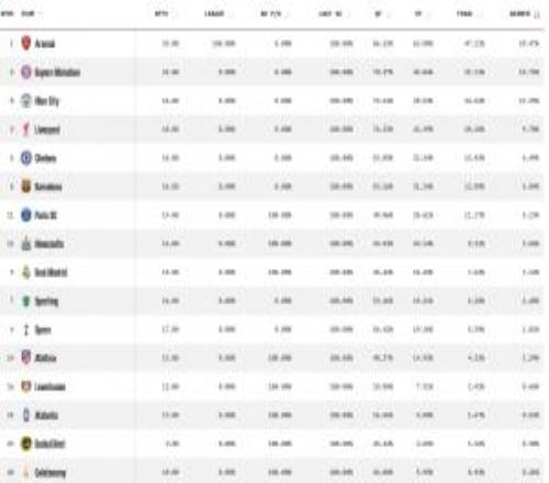 opta预测欧冠冠军概率:阿森纳29.47%最高拜仁第二,皇马低于纽卡