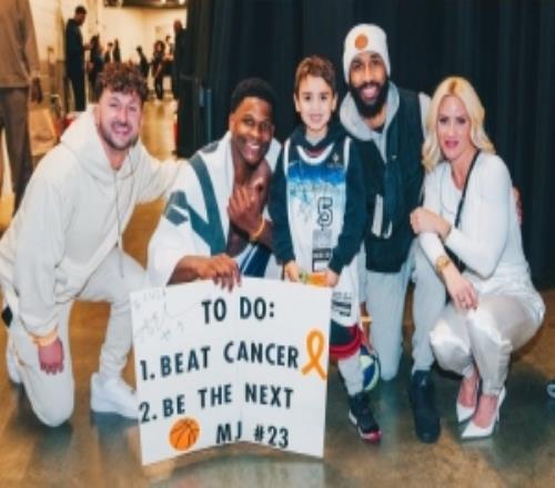 体育播报2月27日宣 今日森林狼官方晒照,曾赠予爱德华兹橙色手环的小朋友卢卡·赖特目前已经战胜了癌症,并与爱...