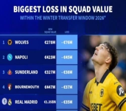 冬窗后身价下跌榜:狼队、那不勒斯、桑德兰前三,皇马、多特在列