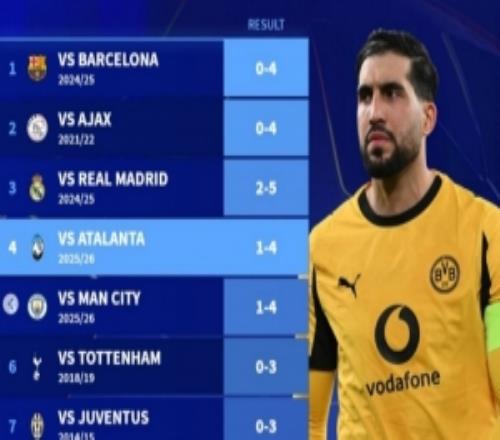多特欧冠最大比分失利榜:04巴萨居首,本赛季14亚特兰大在列