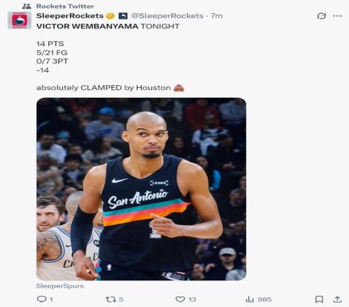 探花惊艳!火箭16分大逆转复仇马刺,杜兰特18+7,文班低迷21中5