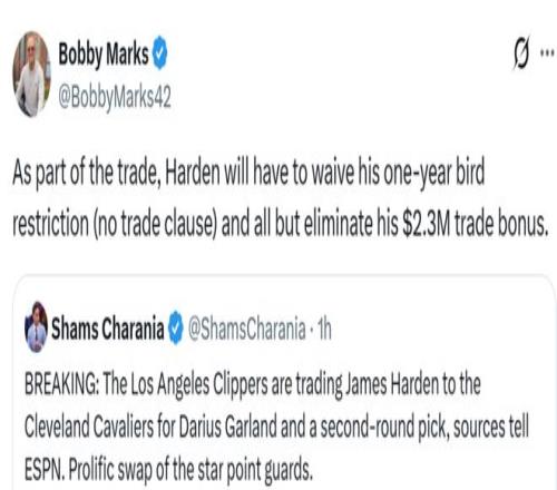 后续ESPN薪资专家Bobby Marks跟进表示,为了促成交易哈登不得不放弃交易否决权,也因此放弃了约230万美元的交易保证金(15%)。