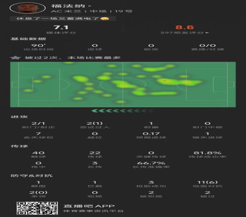 体育播报2月4日宣 今天凌晨,AC米兰在意甲3-0击败博洛尼亚,福法纳首发并踢满90分钟,以下为他本场比赛的数据。