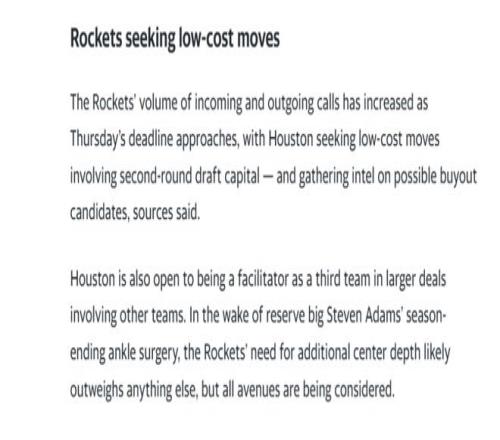 由于亚当斯赛季报销,补强中锋位置是火箭队的迫切需求,此外,休城也愿意作为第三方参与其他球队的大型交易,目前正在衡量所有可行方案。