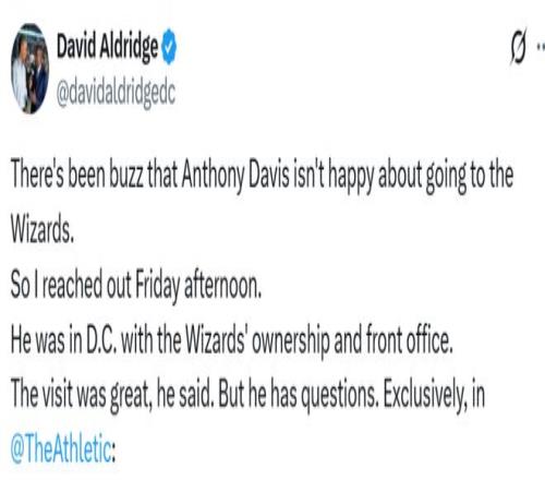 体育画报资深NBA记者曼尼克斯曾在报道中称,戴维斯“似乎对加盟奇才兴致不高”,并在播客节目中再次强调这一观点。但戴维斯表示,目前所见的一切都让他心生好感。