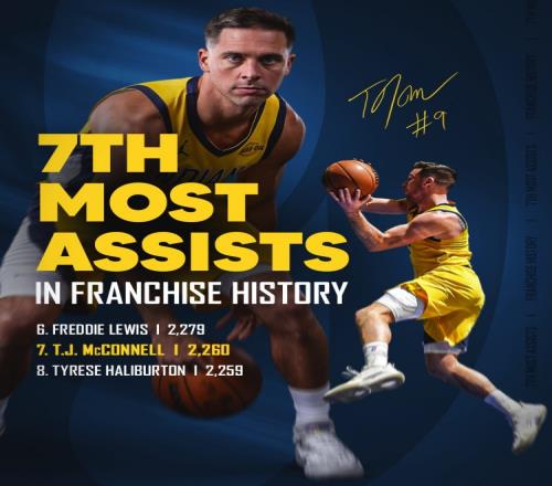 麦康纳在步行者生涯的总助攻数来到了2260次,这让他超越了哈利伯顿(2259次),位居队史第7。