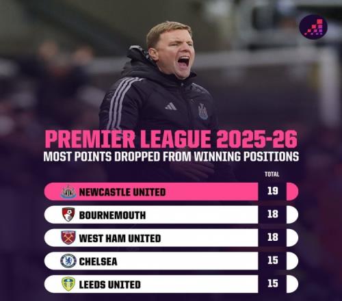 本赛季英超领先情况下丢分榜:
