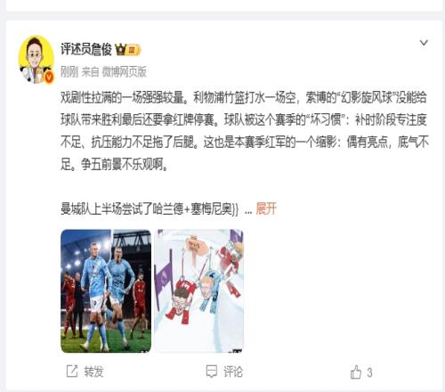 体育播报02月09日宣 曼城本轮2-1惊险逆转曼城,赛后,评述员詹俊发文点评。