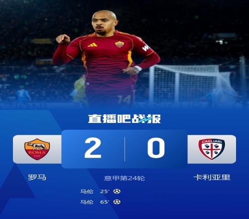 马伦梅开二度,罗马2-0卡利亚里。积分榜方面,罗马46分追平第四尤文,卡利亚里28分第十二。