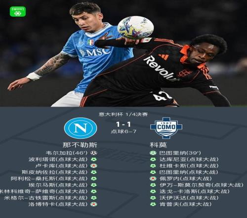 北京时间2月11日意大利杯 1/4决赛,那不勒斯对阵科莫。上半场,奥利韦拉送点,巴图里纳罚入。下半场,韦尔加拉单刀破门扳平比分。90分钟战罢,两队1-1战平进入点球大战。点球大战中,卢卡库和洛博特卡失点,那不勒斯最终以总分7-8无缘意大利杯4强。