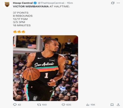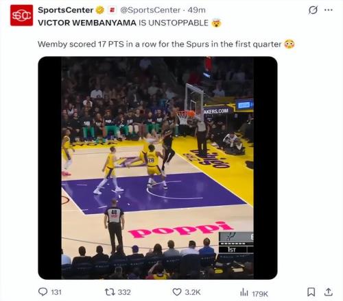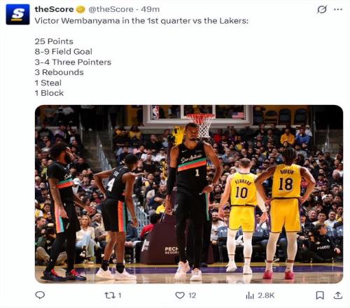 北京时间2月11日,NBA常规赛,马刺大胜湖人。这场比赛马刺球星文班亚马表现非常出色,首节8分钟里就拿到25分,半场18分钟拿到37分,三节26分钟拿40+12,文班亚马早早打卡下班。