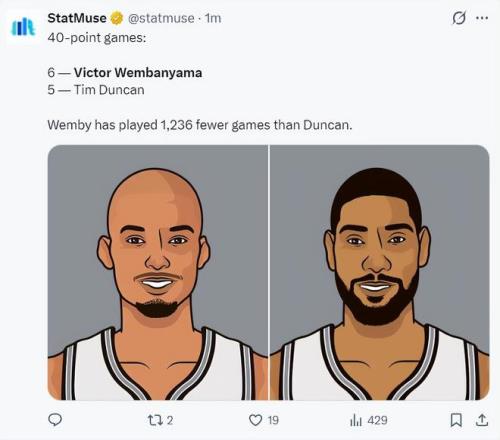 14.文班亚马拿到6次40+,比邓肯少打1236场;