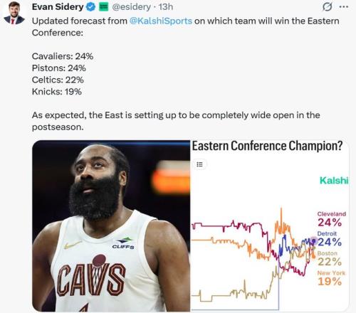 自从得到哈登后,骑士队竞争力飙升,已经成为东部四支争冠热门之一,拿下东部冠军的概率直接追平活塞并列东部第一。