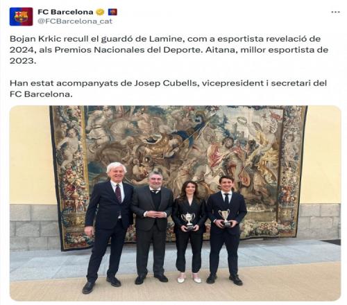 巴萨女足球员邦马蒂获得2023年最佳女子运动员奖,她在2023年赢得女足世界杯冠军和金球奖。巴萨俱乐部副主席库贝利斯陪同出席颁奖典礼。