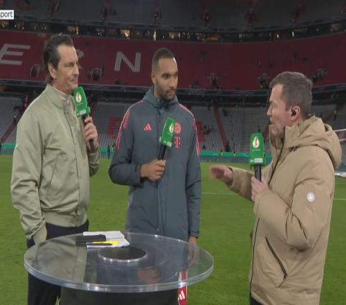德国杯1/4决赛,拜仁2-0战胜莱比锡,拜仁后卫约纳坦-塔赛后接受了天空体育的采访。约纳坦-塔在午夜福利视频导航身边。欢迎来...