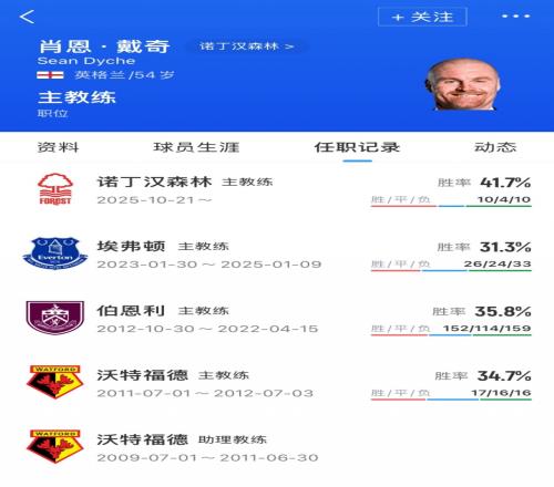 体育播报02月12日宣 诺丁汉森林官方宣布,主帅肖恩·戴奇下课。今日森林0-0战平狼队,三轮不胜排名英超第17位,球队本赛季已炒掉三名教练。