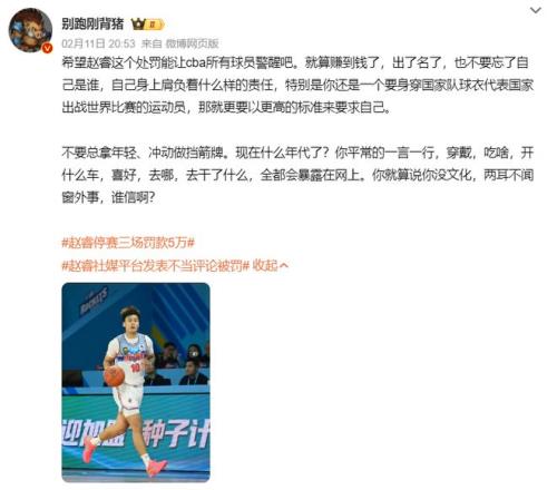 北京时间2月11日,CBA 公司终于对于赵睿的舆论风波给出了回应。此前北京首钢男篮国手赵睿在社交平台上发表了,针对新疆球迷的激烈言论引起了巨大的争议,最终CBA官方也给出了正面回应,开出重磅罚单停赛三场,罚款5万元,以示对于这件事的最终判决。但对于这个结果,很多球迷直言罚的太轻,而名记一针见血说出了问题。