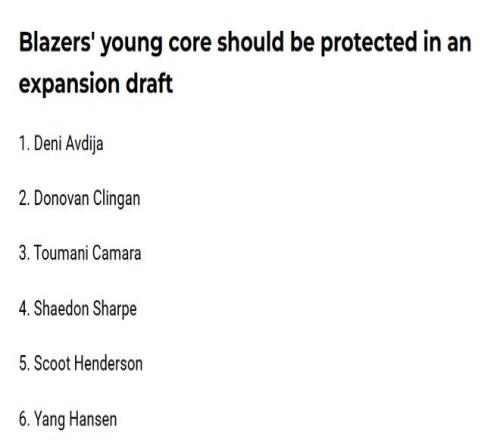 根据之前的规则,每支球队可以保护8名球员,其他球员供新军挑选组建阵容。Rip City Project指出,开拓者扩军选秀应保护的年轻核心包括6人:阿夫迪亚、克林根、卡马拉、夏普、亨德森和杨瀚森。这6人是开拓者的建队基石。其中4人是近年首轮秀,2人是交易捡漏得到的球员,共同构成了持续进步的年轻核心。