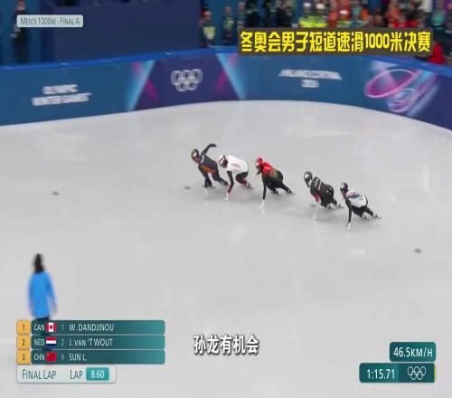 A组决赛5名选手,孙龙孤军奋战,倒数第二圈时孙龙还在第4,随后开始发力超越,最后一个弯道升至第2,冲线时只比范特沃特慢了0.028秒,只差半个冰刀的距离!