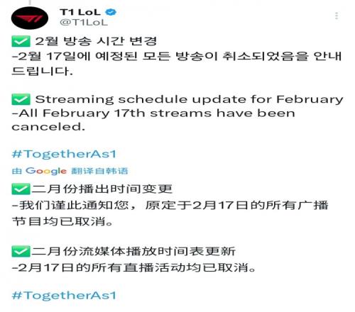 体育播报2月15日宣 今日LCK杯季后赛T1不敌BFX,赛后官方发布消息:原定于17日的队员直播已经取消。
