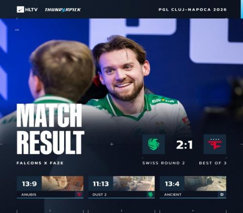 体育播报2月15日宣 PGL克卢日-纳波利今天继续进行,在瑞士轮1-0组中,Falcons以2-1战胜Faze,进入2-0组!FaZe进入1-1组。