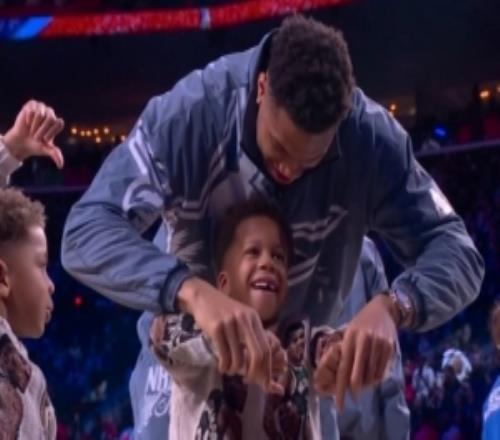 儿子竖起大拇指为小卡加油!字母哥赶紧按下教他拇指向下