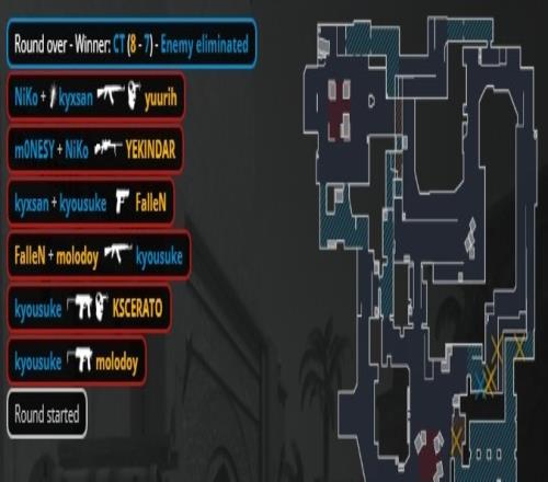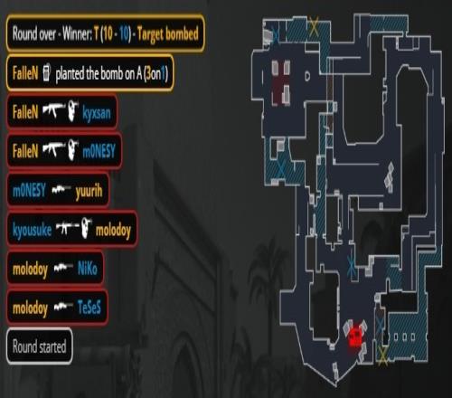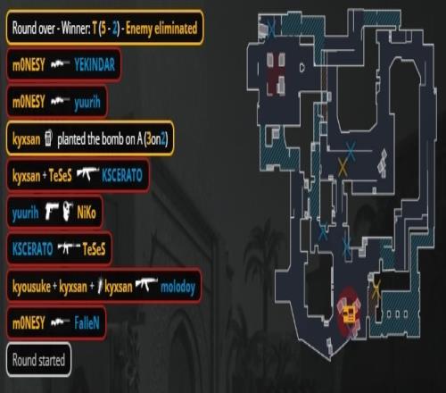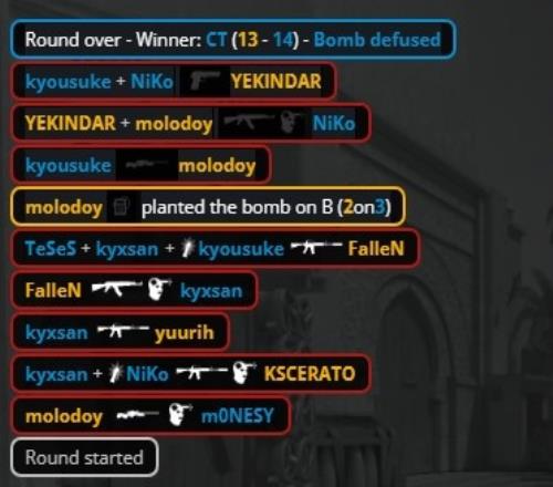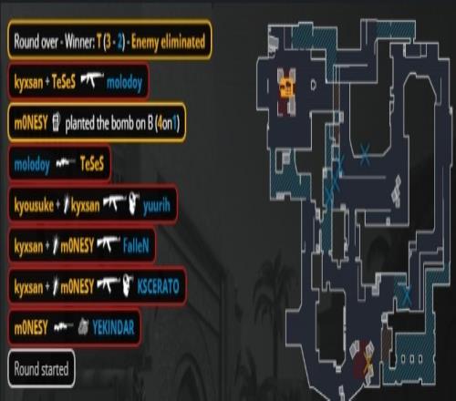 加时赛第3回合,molodoy大狙来A轰掉孩神,K3在A二楼下连收两人被换,龙哥打掉教父,molodoy在B下包,猎鹰三人回防B点,京介大狙轰掉molodoy后手枪再杀狂哥后拆包拿到第14分。