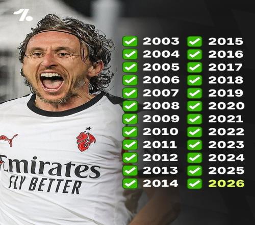 上周末,AC米兰在意甲客场2-1击败比萨,40岁的莫德里奇打入一球。现在他已经连续24年破门,从2003年到2026年从未间断。