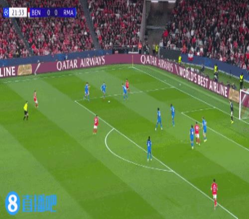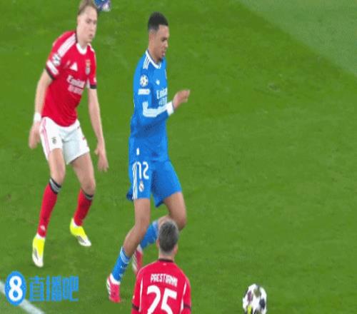 体育播报02月18日宣 欧冠1/8决赛附加赛首回合,皇家马德里客战本菲卡,第22分钟,阿诺德马赛回旋摆脱上抢球员。