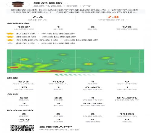 维尼修斯本场比赛具体数据如下: