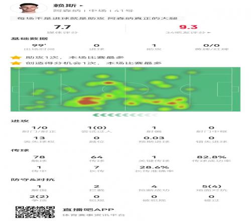 赖斯本场1助攻+7长传2成功2拦截4抢断+7对抗6成功获评7.7分