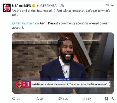 阿里纳斯也谈到了‘疑似杜兰特小号风波’,他说道:太扯淡了,我用小号的话还用第一人称?那我为什么还要切换小号呢?很明显说那个账号是杜兰特小号的家伙就是幕后黑手。