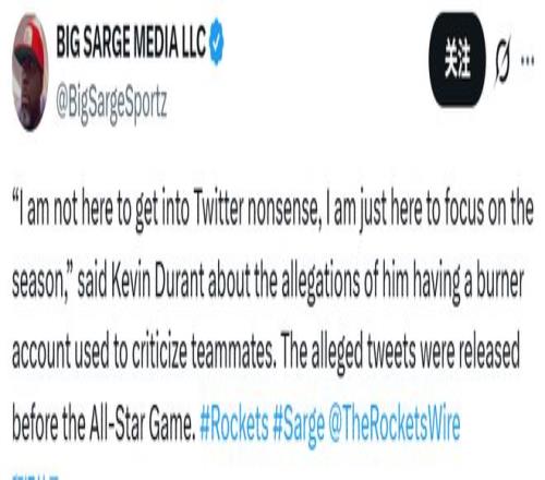 此前,美媒晒出了疑似杜兰特小号的一些言论,当然,目前没有实质证据可以证明这些账号的内容就是杜兰特发的—