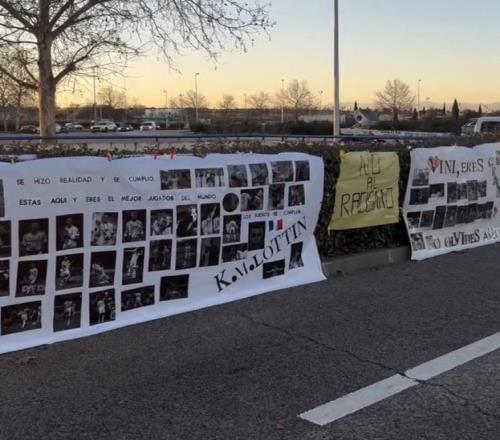 体育播报2月21日宣 皇家马德里球迷在球场外挂起横幅,声援维尼修斯以及姆巴佩,以示对他们反种族歧视斗争的支持。