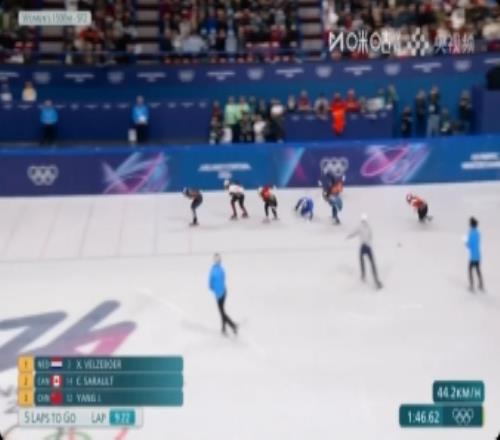 还剩5圈时,荷兰选手舒尔廷和意大利选手孔福尔托拉碰撞后一起摔倒,场上局势大乱,中国香港选手林静欣不久后摔倒,而杨婧茹几乎锁定第三。