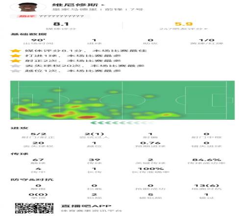 体育播报2月22日宣 皇马在本轮西甲对阵奥萨苏纳,维尼修斯本场数据如下: