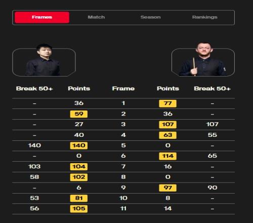 马克·艾伦全场比赛打出一杆破百(107)和三杆50+(55、65、90),赵心童打出两杆破百(140、104)和三杆50+(58、53、56)。