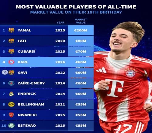 体育播报2月22日宣 拜仁小将卡尔今日迎来18岁生日,数据统计显示他也是历史同龄德转身价并列第四贵的球员。
