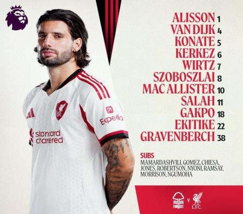 利物浦首发:1-阿利松、6-凯尔凯兹、4-范戴克、5-科纳特、8-索博斯洛伊、38-赫拉芬贝赫、10-麦卡利斯特、7-维尔茨、11-萨拉赫、18-加克波、22-埃基蒂克