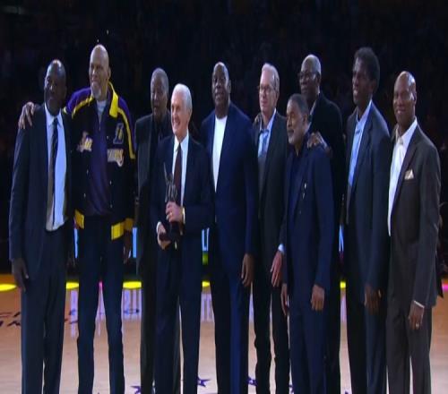 现场,湖人众名宿出席仪式;莱利打趣道:“在所有来的这些人中,只有一个人向我展示了真正的尊重,那就是詹姆斯·沃西(上图左1),他穿了西服打了领带。其他的人都太随意了,每人罚你们2000美元。”