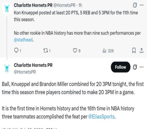 本场比赛结束后,克努佩尔已经命中198记三分,距离超越基根-穆雷保持的206记三分新秀历史纪录仅差8球,而常规赛还剩多达24场,克努佩尔超越他并大幅刷新纪录只是时间问题。