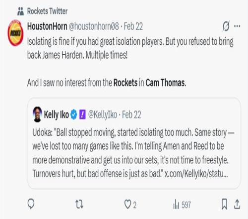 一天之前,火箭领先尼克斯18分被逆转,尤其是末节15-33进攻端崩盘。休媒就炮轰过斯通的运作,对卡姆-托马斯没有兴趣是败笔。