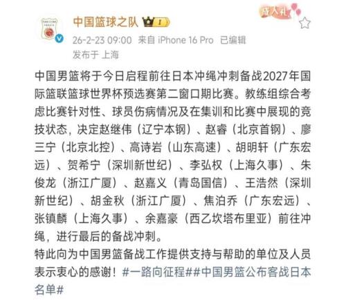 2027年男篮世界杯亚洲区预选赛第二窗口期赛事临近,中国男篮正式公布了客战日本队的14人名单,时下为西乙埃斯特拉俱乐部效力的余嘉豪赫然在列,他也是本次名单中唯一一位海外征战的球员。