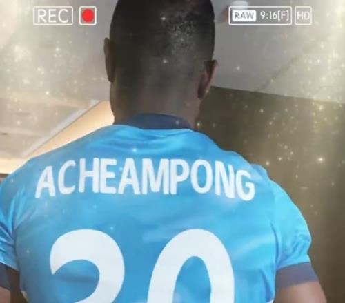 视频当中,阿奇姆彭以服务生的身份,用天津话、粤语、河南话向新队友们打起了招呼。视频最后,他脱掉了卫衣,亮出了自己的新身份——大连英博30号球员阿奇姆彭。