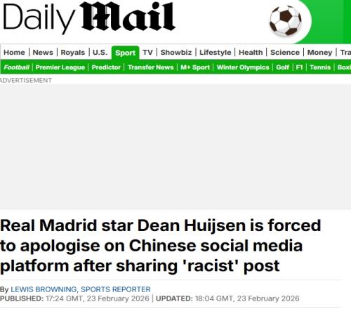 英媒关注!邮报报道赫伊森事件:微博道歉,其余官方社媒均未提及