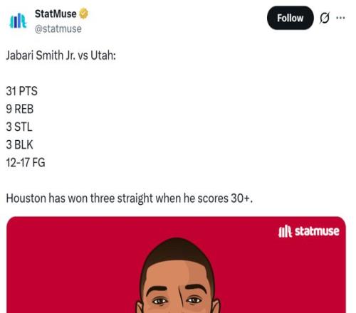 对于严重缺乏投射威胁的火箭队来说,小贾已经成为球队赢球风向标,本赛季当他拿下30+得分表现时火箭队3胜0负保持不败。