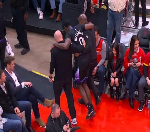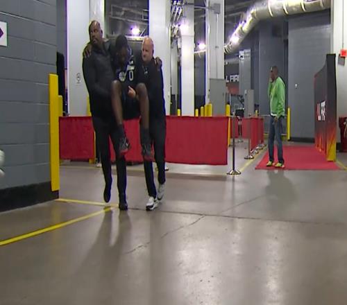 体育播报02月24日宣 NBA常规赛,火箭vs爵士,在第二节一次快攻中,伊森撞飞了文斯·威廉姆斯跟进暴扣,后者跪倒在场边,最终被两名工作人员抬出场。