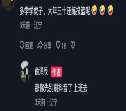 辽宁男篮本赛季的表现比较糟糕,主要是国内球员出现了断档的情况,外援选择方面也不给力。在春节假期期间,不少球员都选择了休息和放松,不过也有球员没有松懈,而是在继续提升自己。比如李虎翼,他甚至在除夕那天还在自己加练。有球迷看到俞泽辰23日发布的自己的骑马视频后,在下面留言,表示让他学学虎子,大年三十还在练投篮呢。对此俞泽辰直接怼了回去,表示该球迷先别刷视频了,该上班去。两人的这一问一答引发了球迷热议。
