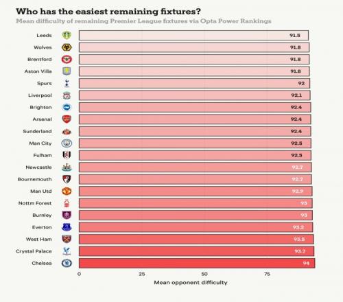 体育播报2月25日宣 Opta超级计算机评出了各队英超剩余赛程难易度榜单,利兹联最容易,切尔西最难。