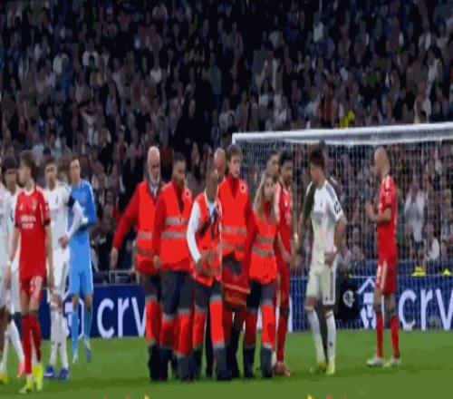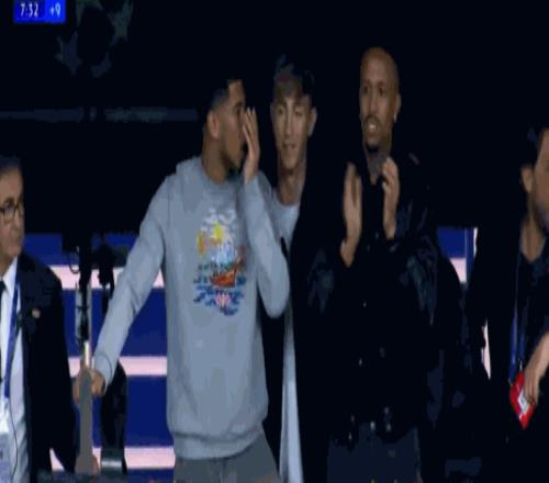 第90+7分钟,镜头再次给到场边,赫伊森和贝林厄姆、米利唐场边观战
